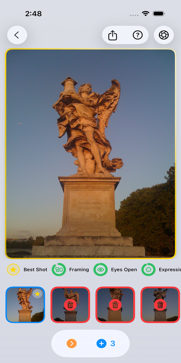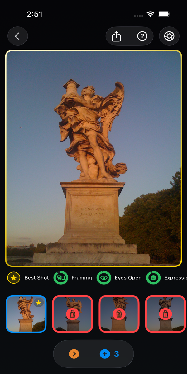 Evaluates sharpness, exposure, and color balance to identify the best shot technically